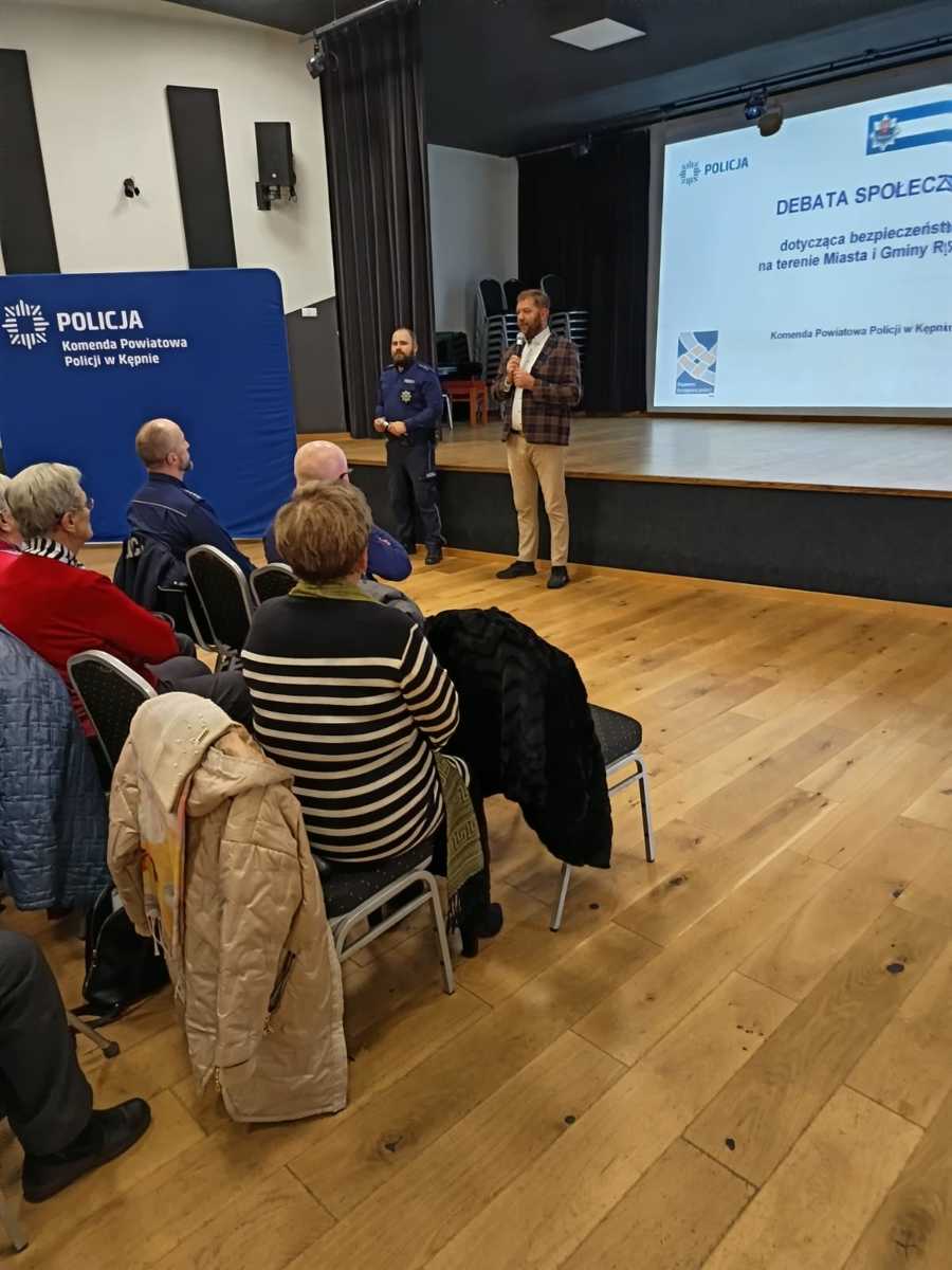 Spotkanie było okazją do omówienia funkcjonowania aplikacji „ Krajowa Mapa Zagrożeń Bezpieczeństwa”. Przedstawione zostały programy i akcje profilaktyczne przeprowadzone na terenie miasta i gminy Rychtal. Debatę prowadził mł. asp. Filip Ślęk. W dalszej części debaty głos zabrał Kierownik Posterunku Policji w Rychtalu asp. szt. Radosław Jędrasiak, który przedstawił statystykę przestępstw i wykroczeń. Uczestniczyli w niej Burmistrz Gminy Rychtal, mieszkańcy Rychtala, Naczelnik Wydziału Prewencji, Kierownik Posterunku Policji w Rychtalu, policjanci.