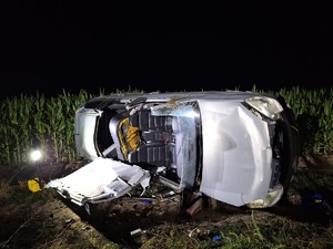 Policjant Wydziału Kryminalnego Komendy Powiatowej Policji w Kępnie wracając ze służby zatrzymał mężczyznę, który poruszając się z dużą prędkością na prostym odcinku drogi gminnej Kępno-Żurawiniec stracił panowanie nad kierowanym przez siebie pojazdem, wypadł z drogi w wyniku czego pojazd kilkukrotnie dachował na terenie przydrożnego pola uprawnego, a następnie uciekł, pozostawiając ranną pasażerkę w pojeździe.